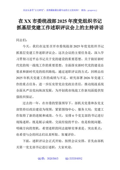 / 在XX市委统战部2025年度党组织书记抓基层党建工作述职评议会上的主持讲话