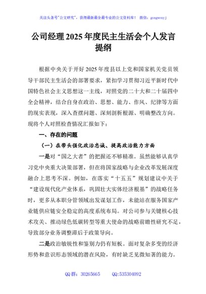 / 公司经理2025年度民主生活会个人发言提纲