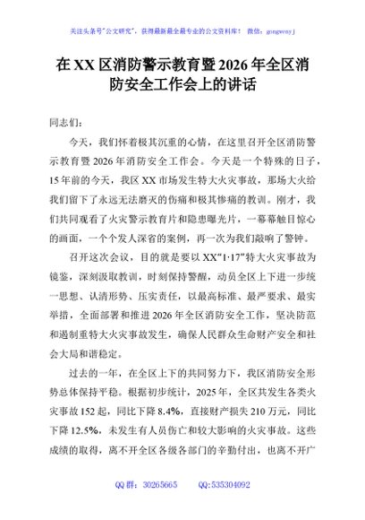 / 在XX区消防警示教育暨2026年全区消防安全工作会上的讲话