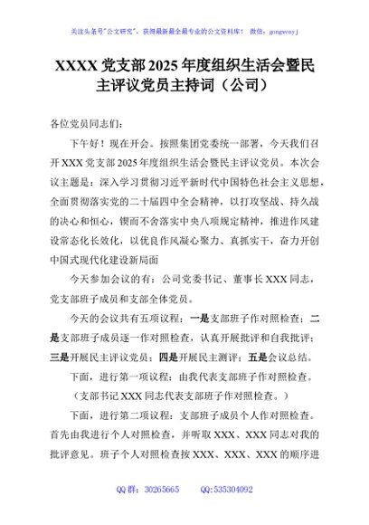 XXXX党支部2025年度组织生活会暨民主评议党员主持词(公司)