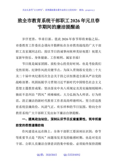 / 致全市教育系统干部职工2026年元旦春节期间的廉洁提醒函
