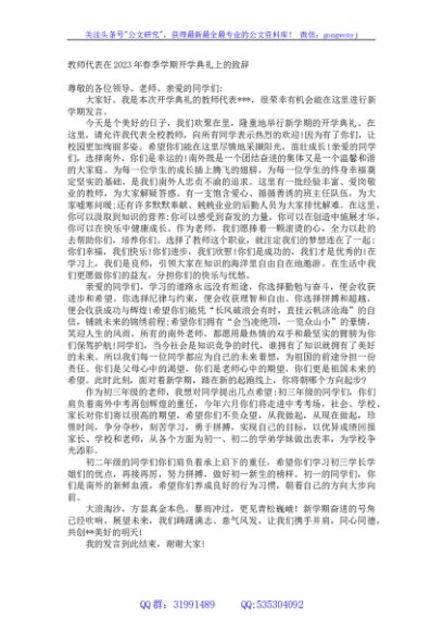 / 教师代表在2023年春季学期开学典礼上的致辞