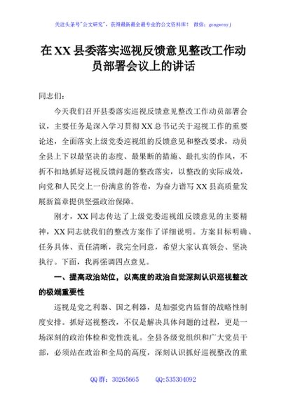 / 在XX县委落实巡视反馈意见整改工作动员部署会议上的讲话