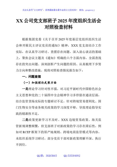 XX公司党支部班子2025年度组织生活会对照检查材料