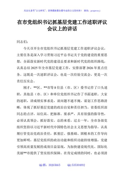 / 在市党组织书记抓基层党建工作述职评议会议上的讲话