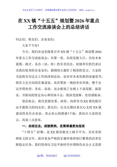 / 在XX镇“十五五”规划暨2026年重点工作交流座谈会上的总结讲话