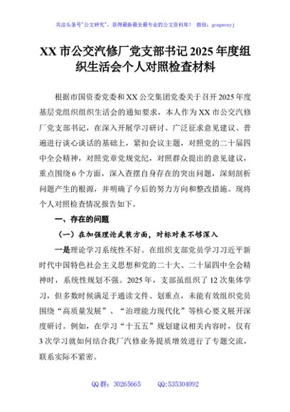 / XX市公交汽修厂党支部书记2025年度组织生活会个人对照检查材料