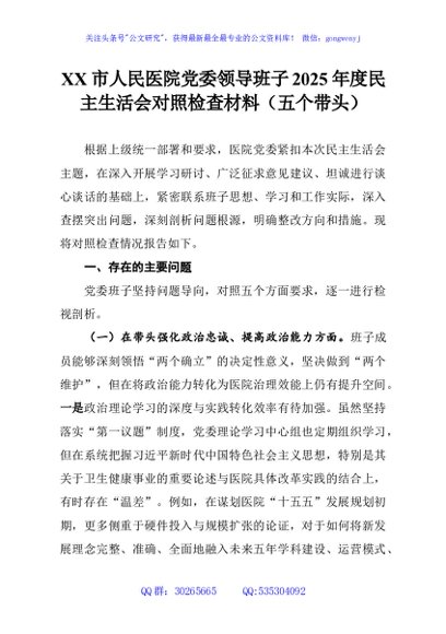 / XX市人民医院党委领导班子2025年度民主生活会对照检查材料(五个带头)