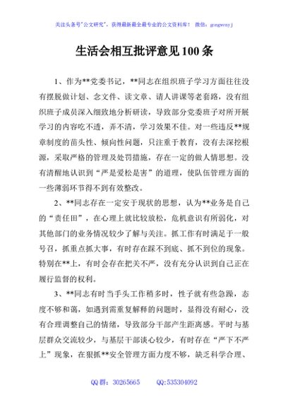 / 生活会相互批评意见100条