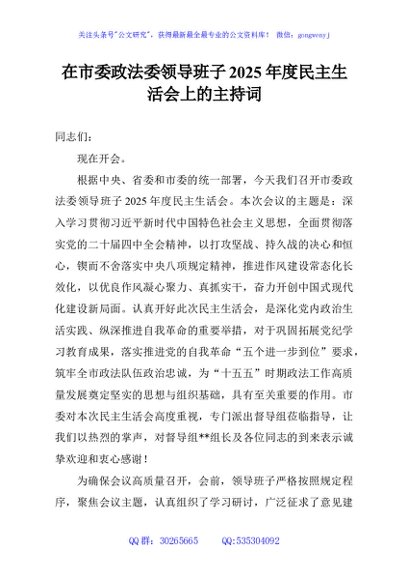 / 在市委政法委领导班子2025年度民主生活会上的主持词