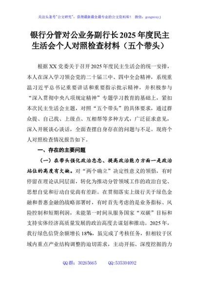 / 银行分管对公业务副行长2025年度民主生活会个人对照检查材料(五个带头)