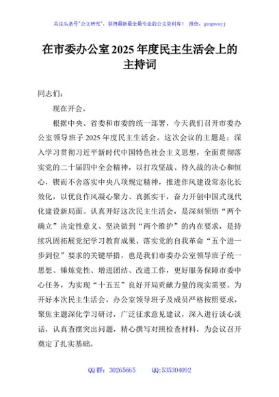 / 在市委办公室2025年度民主生活会上的主持词