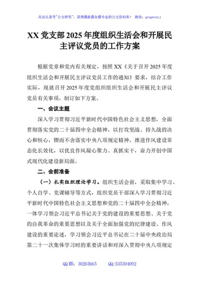 / XX党支部2025年度组织生活会和开展民主评议党员的工作方案