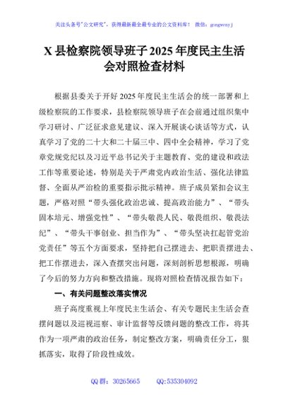 / X县检察院领导班子2025年度民主生活会对照检查材料