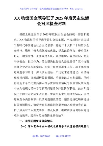 / XX物流国企领导班子2025年度民主生活会对照检查材料
