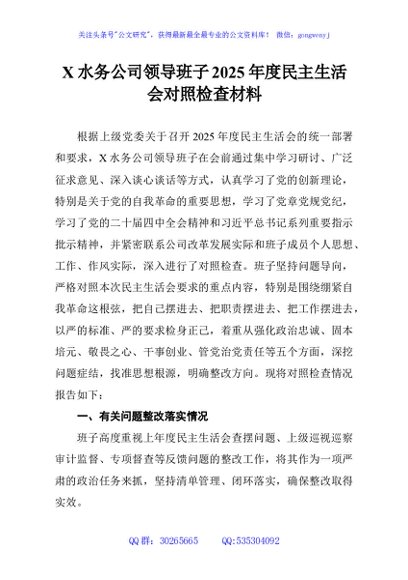/ X水务公司领导班子2025年度民主生活会对照检查材料