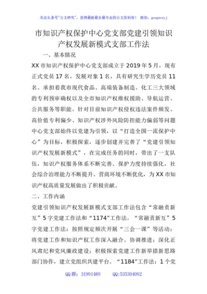 / 市知识产权保护中心党支部“党建引领知识产权发展新模式”支部工作法(党建品牌)