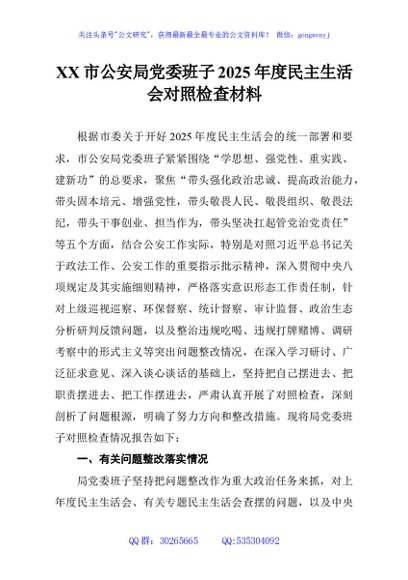 / XX市公安局党委班子2025年度民主生活会对照检查材料