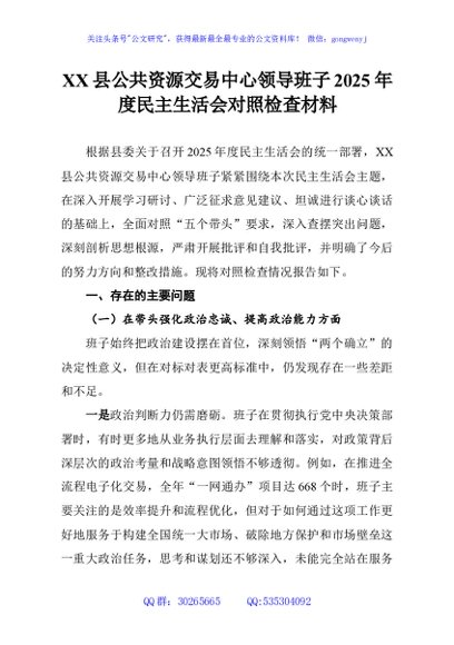 / XX县公共资源交易中心领导班子2025年度民主生活会对照检查材料
