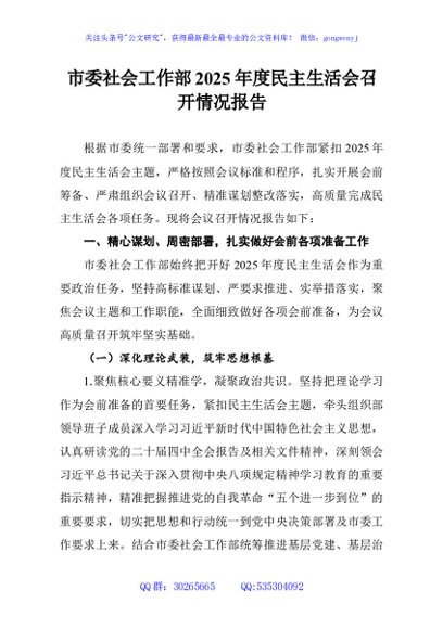/ 市委社会工作部2025年度民主生活会召开情况报告