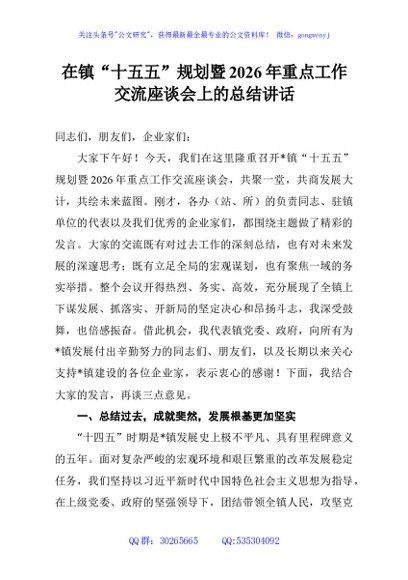 / 在镇“十五五”规划暨2026年重点工作交流座谈会上的总结讲话