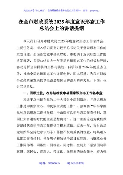 / 在全市财政系统2025年度意识形态工作总结会上的讲话提纲
