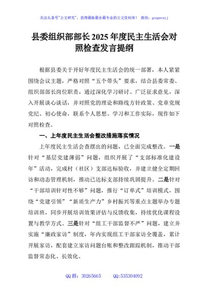 / 县委组织部部长2025年度民主生活会对照检查发言提纲