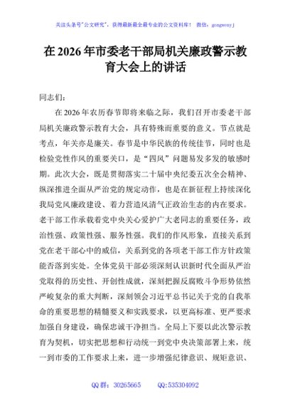 / 在2026年市委老干部局机关廉政警示教育大会上的讲话