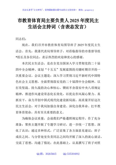 / 市教育体育局主要负责人2025年度民主生活会主持词(含表态发言)