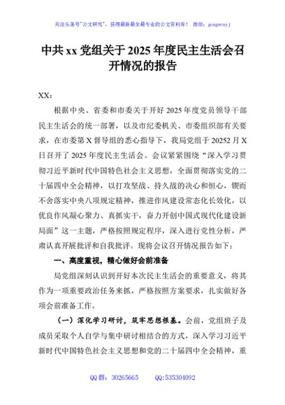 / 中共xx党组关于2025年度民主生活会召开情况的报告