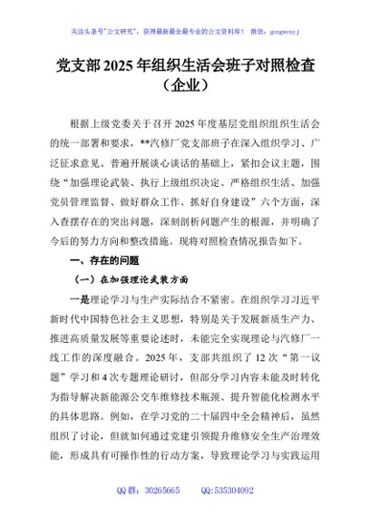 / 党支部2025年组织生活会班子对照检查(企业)