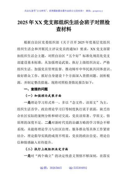 / 2025年XX党支部组织生活会班子对照检查材料