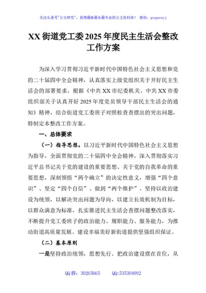 / XX街道党工委2025年度民主生活会整改工作方案