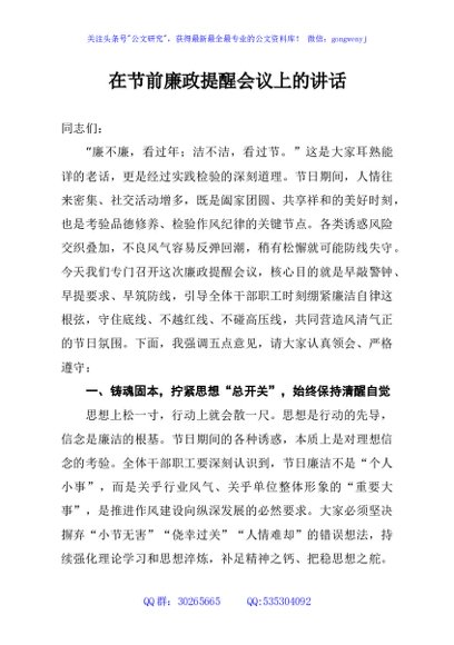 / 在节前廉政提醒会议上的讲话
