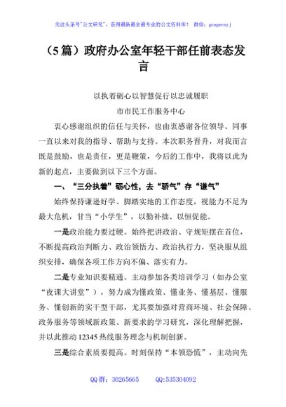 / (5篇)政府办公室年轻干部任前表态发言