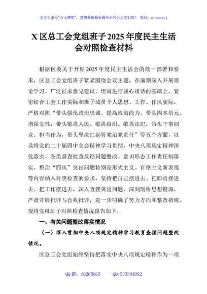 / X区总工会党组班子2025年度民主生活会对照检查材料