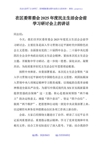 / 在区委常委会2025年度民主生活会会前学习研讨会上的讲话
