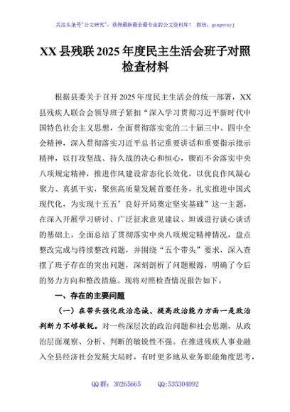 / XX县残联2025年度民主生活会班子对照检查材料