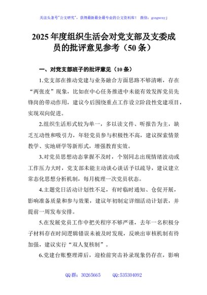 / 2025年度组织生活会对党支部及支委成员的批评意见参考(50条)