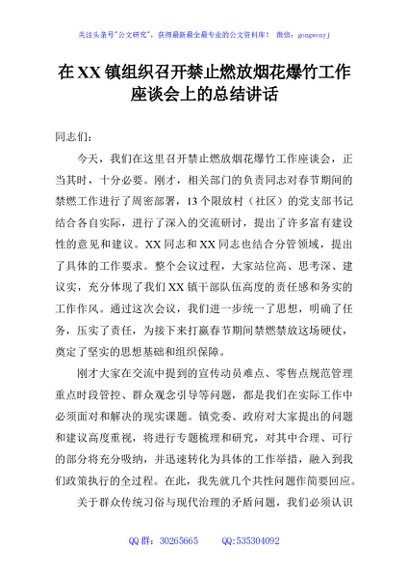 / 在XX镇组织召开禁止燃放烟花爆竹工作座谈会上的总结讲话