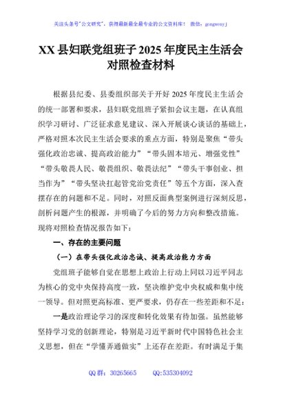 / XX县妇联党组班子2025年度民主生活会对照检查材料