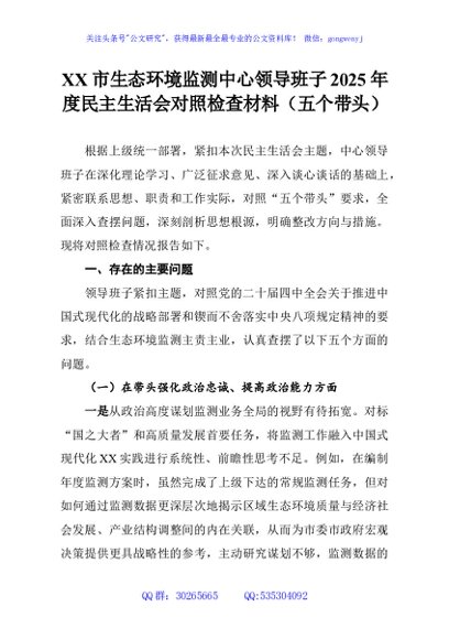 / XX市生态环境监测中心领导班子2025年度民主生活会对照检查材料(五个带头)