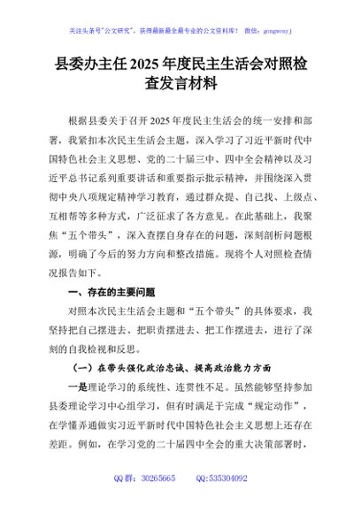 / 县委办主任2025年度民主生活会对照检查发言材料