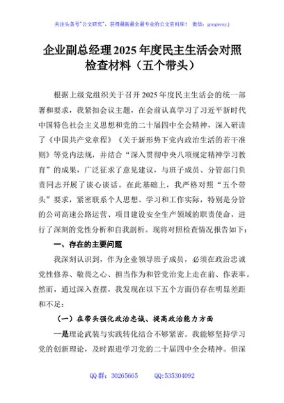 / 企业副总经理2025年度民主生活会对照检查材料(五个带头)