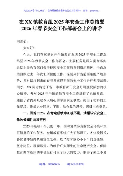 / 在XX镇教育组2025年安全工作总结暨2026年春节安全工作部署会上的讲话