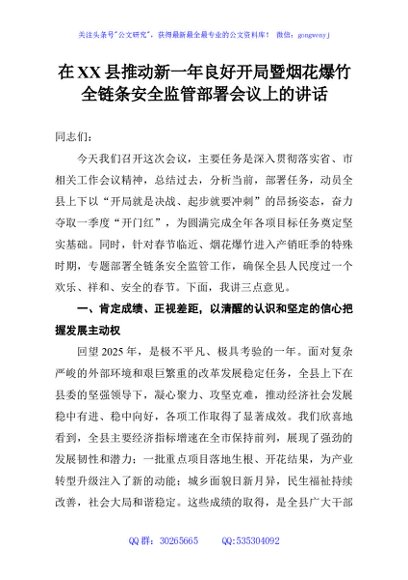 / 在XX县推动新一年良好开局暨烟花爆竹全链条安全监管部署会议上的讲话