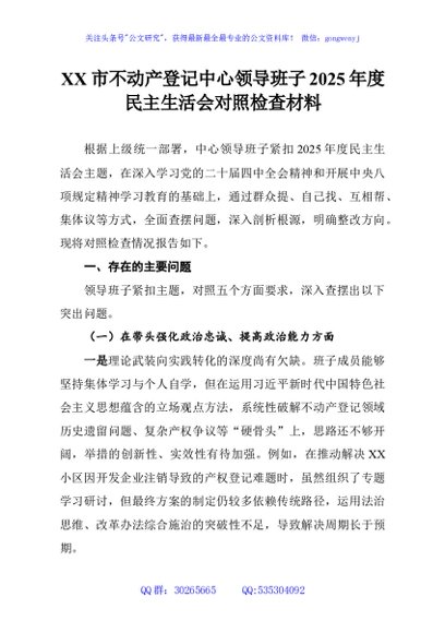/ XX市不动产登记中心领导班子2025年度民主生活会对照检查材料