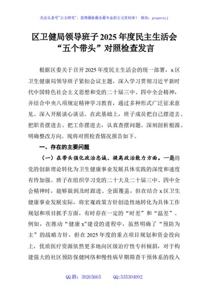 / 区卫健局领导班子2025年度民主生活会“五个带头”对照检查发言