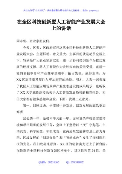 / 在全区科技创新暨人工智能产业发展大会上的讲话