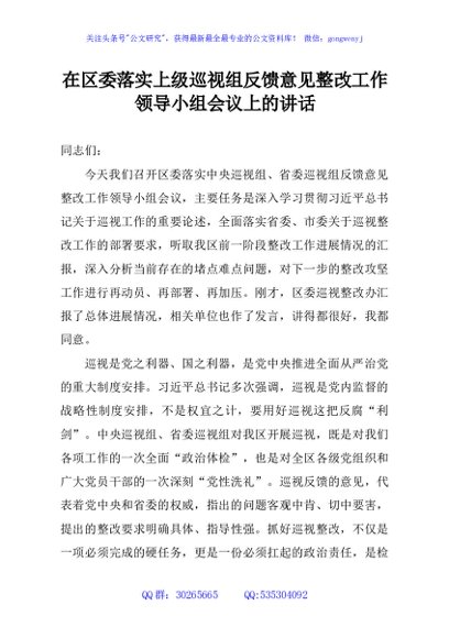 / 在区委落实上级巡视组反馈意见整改工作领导小组会议上的讲话